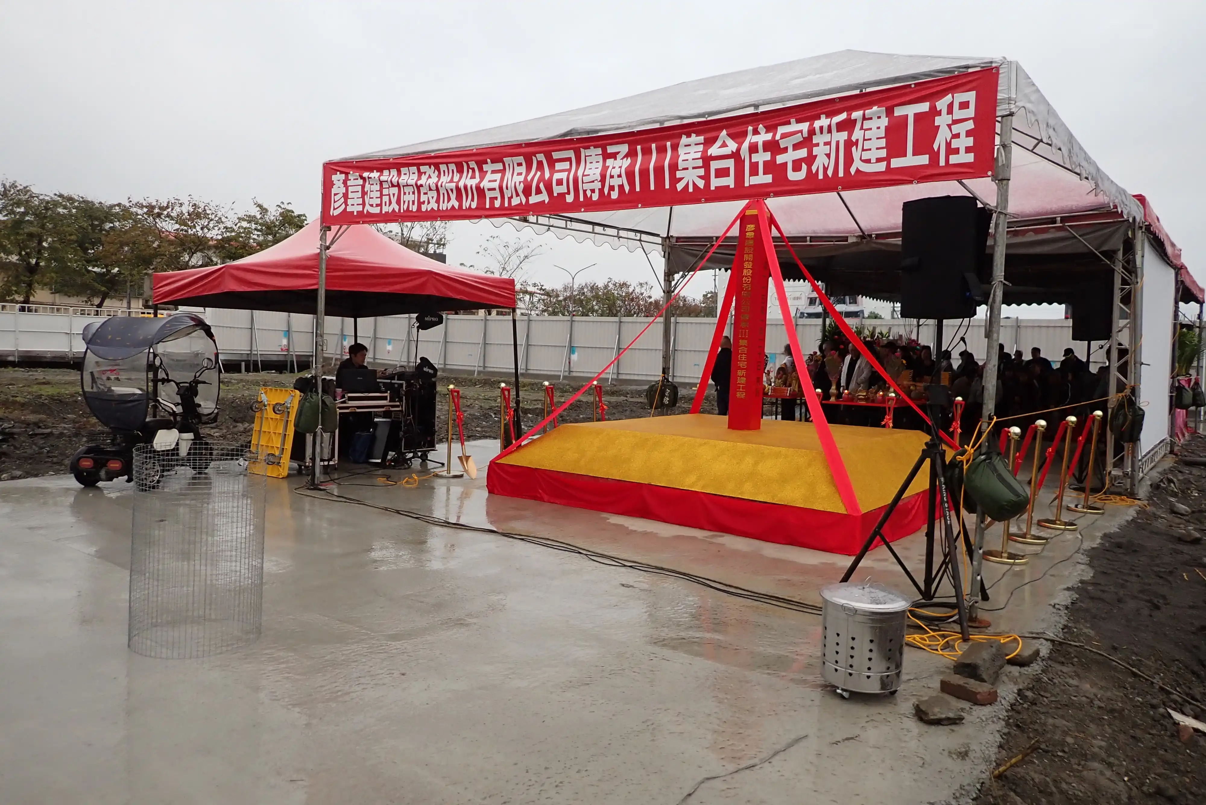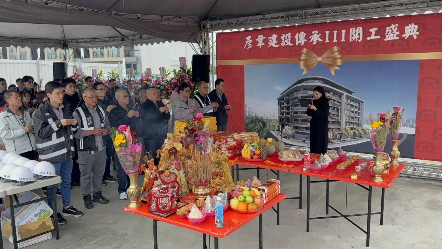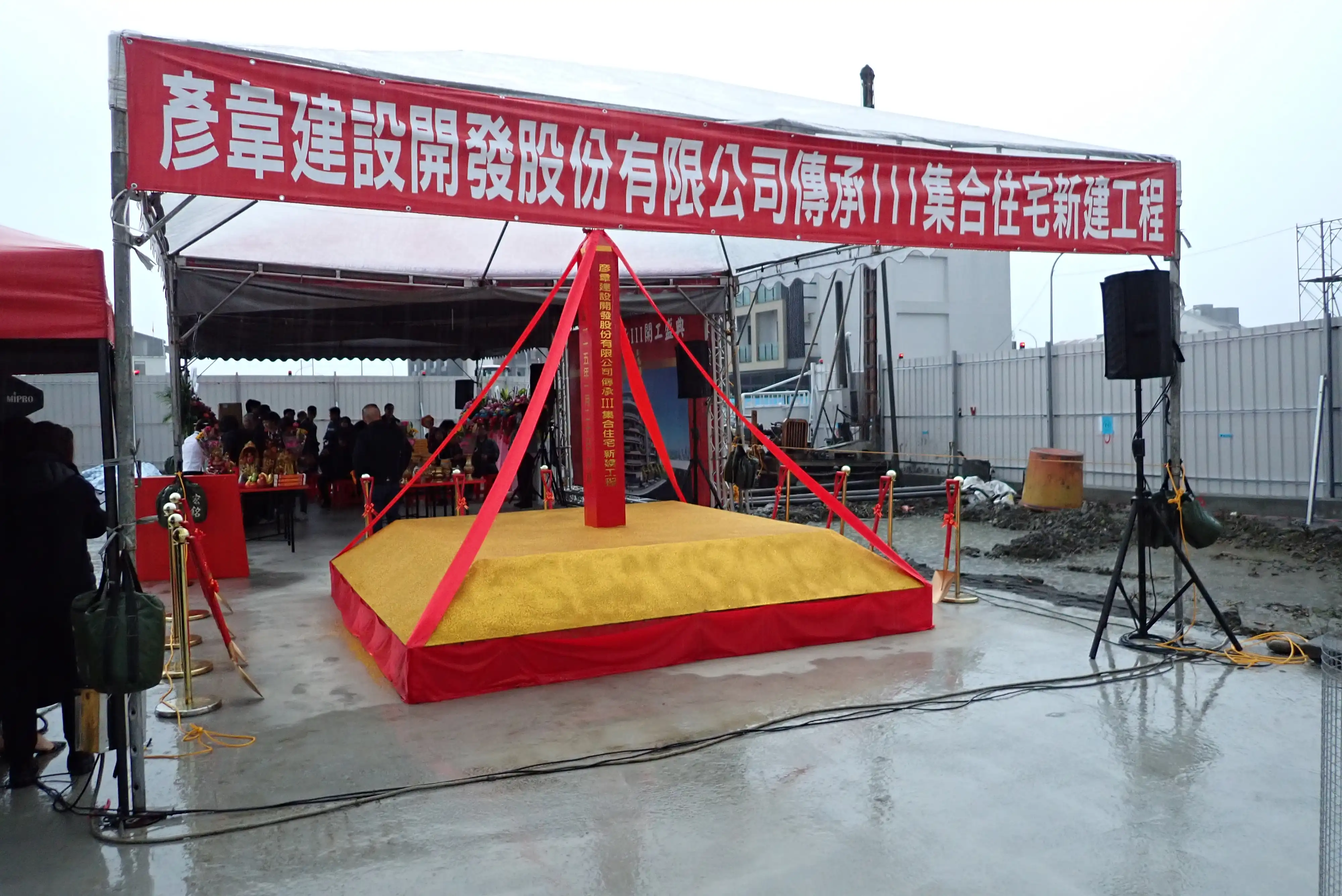 彥韋建設開發股份有限公司董事長游啓東偕同總經理林錦發,於良辰吉時持禮主祭,率領各界貴賓齊聚於宜蘭市新公園段9地號,共襄盛舉「傳承III」集合住宅新建工程開工動土典禮。典禮中,全體貴賓與工程團隊代表共同虔誠祈福,祈求天地護佑,工程人員出入平安、身體健康;工地施工順利、公安無虞;銷售成功、財源廣進,並期盼工程如期圓滿落成。